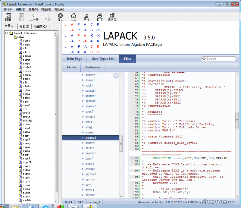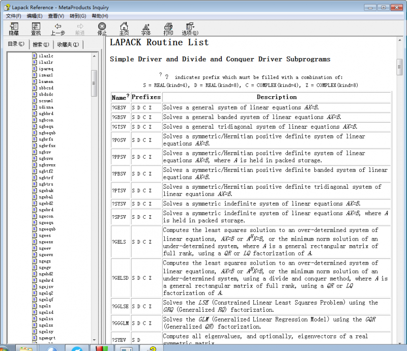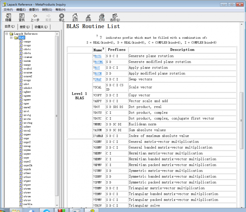 单精度的文档脱机浏览,双精度及复数的可以点击页内链接联网浏览 BLAS库 2015-06-10_110320.png 2015-06-10_110332.png LAPACK库 2015-06-10_110407.png 2015-06-10_110649.png |