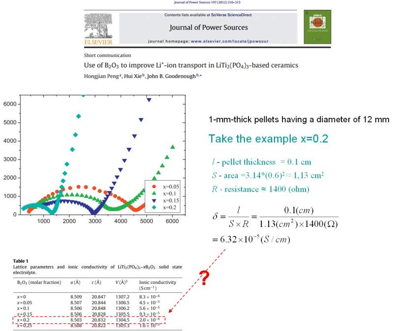 如下图所示: 以x=0.2 为例,pellet 厚度约 0.1cm,pellet的直径为1.2cm,阻抗测试电阻约1400欧姆,计算得出电导率约6.3x10-5 S/cm,而文章报道的结果是2x10-4 S/cm。 请问,我的计算错在哪里了? 1.jpg |