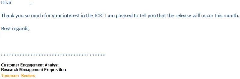 今天发信给路透社相关部门,据路透社工作人员透露,今年影响因子报告将会在这个月发布,大家尽情期待吧。。。