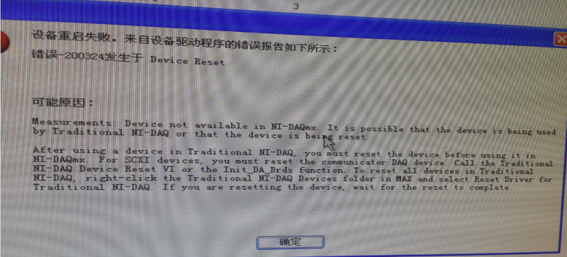 我安装的是Labview8.6 ,DAQmx版本是8.8,安装完之后发现MAX里面自带的PXI-6115的测试面板打开失败,在MAX里重启采集卡6115时会出现以下提醒。我是新手,无从下手,请大神告诉我是什么原因。小弟感激不尽。
