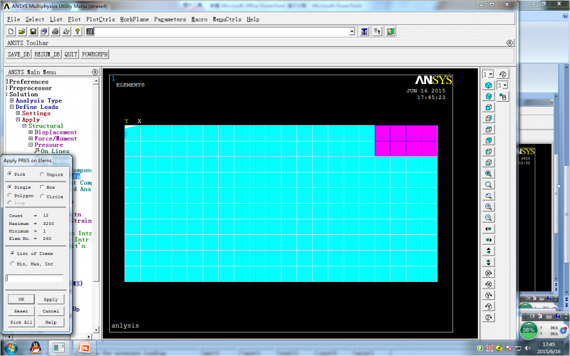 在物体上表面的右上方用施加压力 pressure-----on elements 命令选中六个元素 见图四