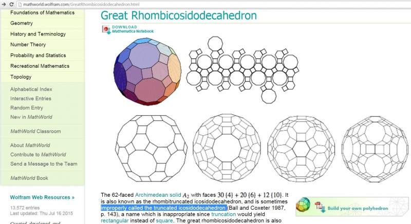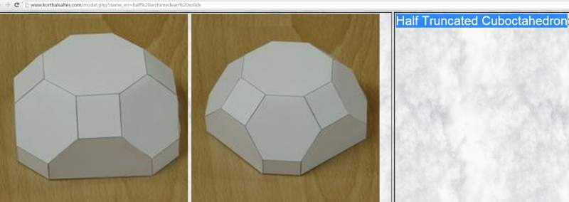 学命: Rhombicosidodecahedron 昵称: Truncated Cuboctahedron 可坚持用 Wolfram Mathematica 软件画 [图1] https://mathworld.wolfram.com/GreatRhombicosidodecahedron.html 或听我劝截以下屏幕图 [图2] https://www.korthalsaltes.com/mo ... rchimedean%20solids 上述网站均含程序或折纸链接, 预计截屏幕图还是最快的显示方法 请教: 黑白照片里的是什么化合物 ?? 如不方便, 请发论坛站内电邮给我, 谢谢 !! ------------ [ Wolfram Matrhmatica ] Rhombicosidodecahedron.jpg Half Truncated Cuboctahedron.jpg |
