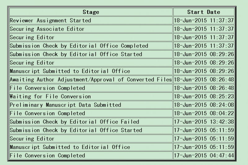 从投JAP到现在一共经历了85天,好不容易上周从审稿人那得到小修意见,最近编辑让我改格式和图等,但是今天查看了一下状态成下面这样子,我不知道是什么意思,Reviewer Assignment Started难道意思是说又找审稿人了?还是说让副编辑正在审,求虫友们帮助
