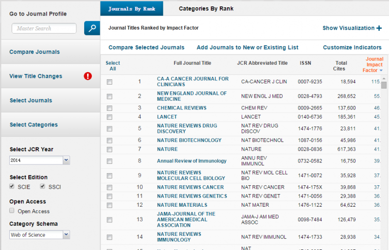 最近Journal Citation Reports 换了个新版 具体有什么新功能大家自己探索吧 ![]() Journal Citation Reports®(期刊引证报告,简称 JCR)是一个独特的多学科期刊评价工具。JCR是唯一提供基于引文数据的统计信息的期刊评价资源。通过对参考文献的标引和统计,JCR可以在期刊层面衡量某项研究的影响力,显示出引用和被引期刊之间的相互关系。JCR包括自然科学(Science Edition)和社会科学(Social Sciences Edition)两个版本。其中,JCR- Science涵盖来自83个国家或地区,约2,000家出版机构的8,500多本期刊,覆盖176个学科领域。JCR-Social Sciences涵盖来自52个国家或地区713家出版机构3,000多本期刊,覆盖56个学科领域。 新平台上的JCR 在旧版的基础上开发并加强了数据及其呈现方式,使其更加全面易用。JCR 与Web of Science核心合集的数据无缝链接、自由切换,并采用更加清晰、准确的可视化方式来呈现数据,用户可以更加轻松地创建、存储并导出报告。 登陆Journal Citation Reports® 请访问:https://jcr.incites.thomsonreuters.com/ |