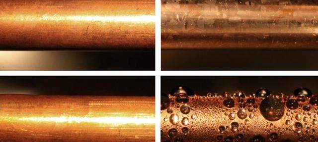图片说明:图的左上角是一个裸铜冷凝器管,右上角是一个涂有石墨烯的冷凝器管。当置于100摄氏度的水蒸气中时,未涂层管产生的水膜转换低效率(左下角所示),而涂层显示更理想的滴状冷凝态(右下角所示)。 图片来源:phys.org