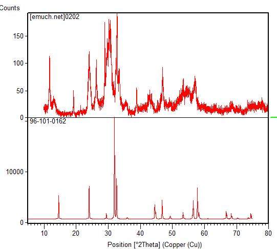 | 如题,XRD物相分析求助。该反应产物由水热法合成,合成体系中的全部元素为Bi, Cl, Na, O 和C。求大神帮忙解析,解析成功后还可追加金币。 |