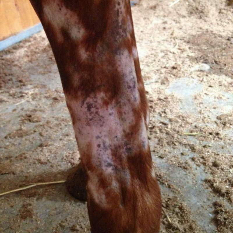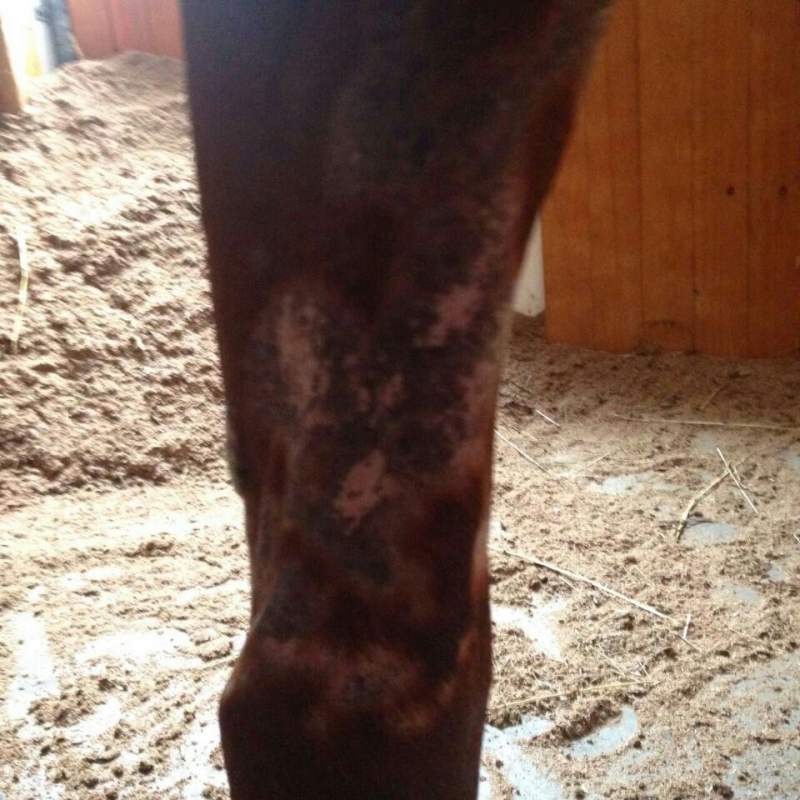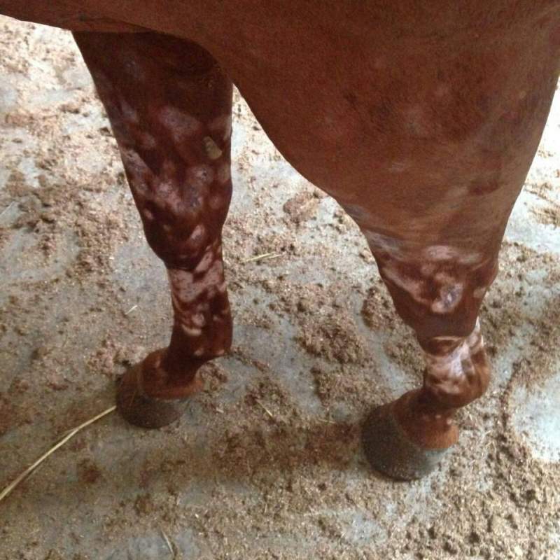 请大家看看,这马得了什么皮肤病?规模50头左右的赛马场,有一匹大马出现这样的情况,还有一匹小马也开始出现,之前发现的时候,也用过外用药洗过皮肤,也内服过伊维菌素等,但还是不见好。请大家帮忙看看,这是什么原因引起的?是否需要做血清检测?或者有什么好方法治疗,谢谢!