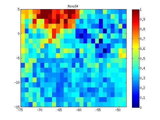 现在遇到一个问题想请各位指点一下. 我已经挑出了一部分的降雨数据,精度1°,每一个数据都是和地理坐标位置存放的一样.如下图 精度(75W,48W)纬度(15S,5N) 存放的数据文件是一个20*27的矩阵,排列的顺序也和图中的点一一对应. mat文件在网盘 http://pan.baidu.com/s/1hqGQVyO 以上就是上图的数据文件,我想把这个图直接画在地图对应的坐标上 类似于上面这样的图,不知道怎么画想求助一下. 我所研究的区域是 这个程序是 clear;clc; %load the map h = worldmap([-40 40], [-180 20]); %find the landarea and color it getm(h,'MapProjection'); geoshow('landareas.shp','FaceColor', [0.15 0.5 0.15]); %mark the lakes and rivers geoshow('worldlakes.shp', 'FaceColor', 'cyan'); geoshow('worldrivers.shp','Color', 'blue'); %Mark the cities in the map geoshow('worldcities.shp', 'Marker', '.','Color', 'red'); setm(gca,'Grid','on'); % geoshow(gca,map,refvec,'DisplayType','texturemap'); % demcmap(map); %mark the pacific ocean labelLat=-150; labelLon= -20; %textm(labelLat,labelLon, 'Pacific Ocean','color','r') textm(-20,-150,'Pacific Ocean','color','b'); %mark the North Atlantic Ocean labelLat=-60; labelLon= 20; %textm(labelLat,labelLon, 'Pacific Ocean','color','r') textm(20,-60,'North Atlantic Ocean','color','b'); %mark the South Atlantic Ocean labelLat=-30; labelLon= -20; %textm(labelLat,labelLon, 'Pacific Ocean','color','r') textm(-20,-30,'South Atlantic Ocean','color','b'); |