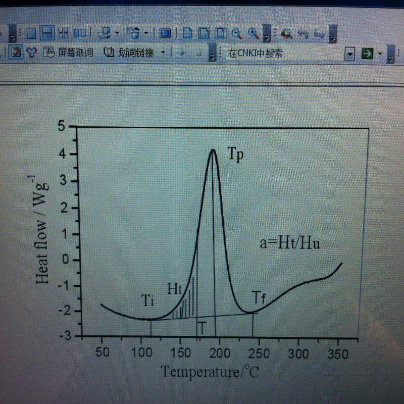已得DSC曲线,想积分放热峰面积求固化度,如下图,需要连接Ti、Tf创建基线TiTf(直线),再积分曲线TiTf与基线TiTf围成的面积,求大神告知详细的origin具体操作,并告知origin版本。