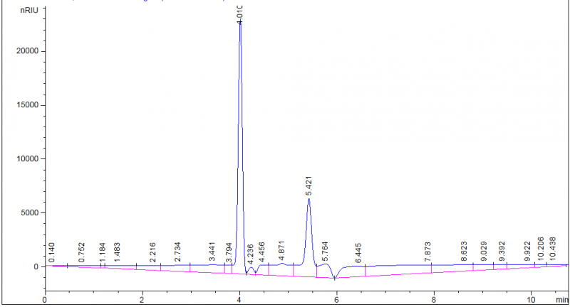 Agilent 1100高效液相色谱仪,示差折光检测器,手动进样。样品为有机多元醇,流动相为不同比例的甲醇水溶液,样品用流动相溶解。