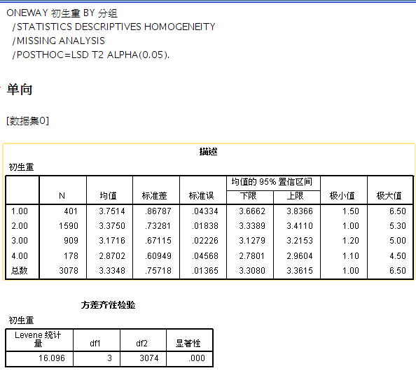 有四组体重数据做统计分析,每组的数目相差比较大,一组大概401,二组1590,三组909,四组178,用SPSS 19 做单因素方差分析。。P值各种为0.。。 折腾了两三天我已经彻底无能了。。请教怎么破? 把结果传上。。希望有人解答。。谢谢谢谢 1.png 2.png 3.png |