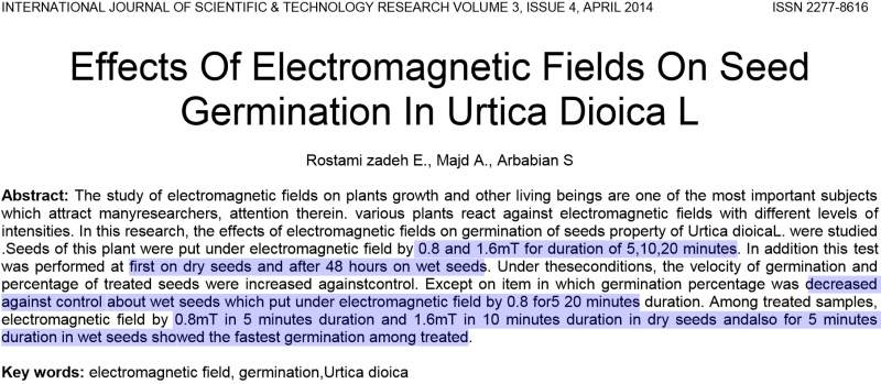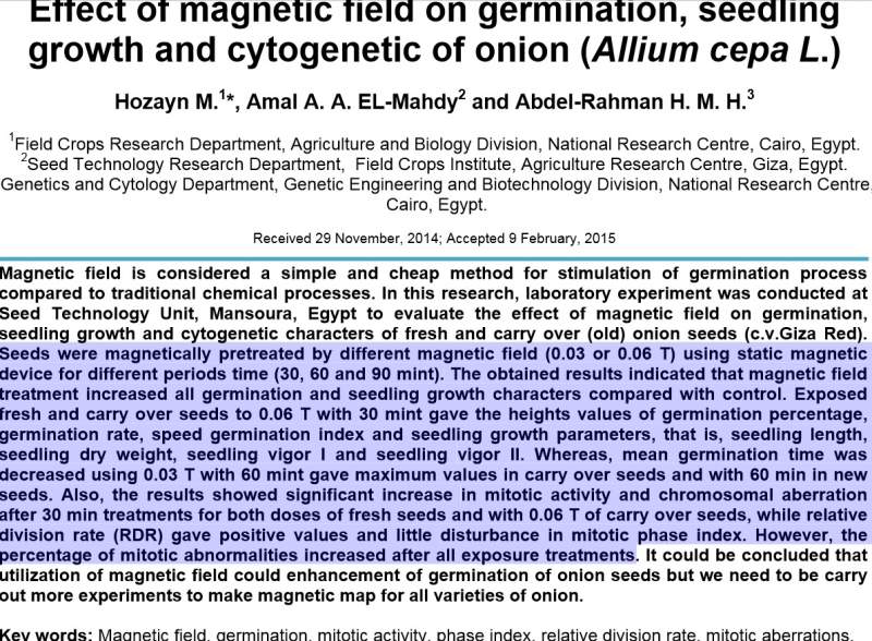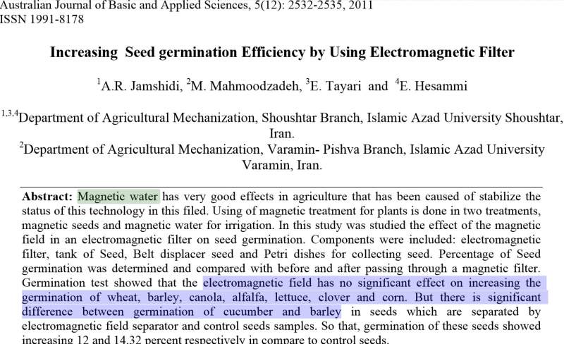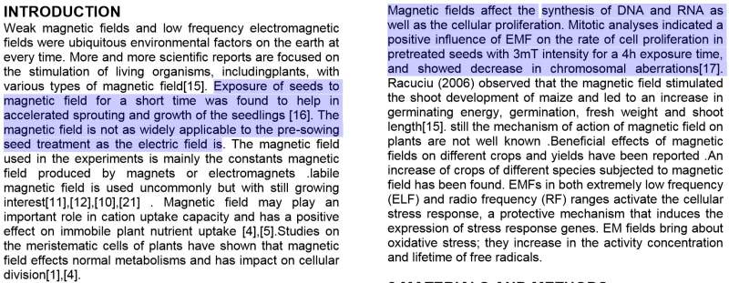 Q1 电磁场 = ElectroMagnetic Fields (EMF) 或 EF / MF 为什么不用常见缩写节省宝贵空间 ?? Q2: 电场和磁场对种子萌发影响不同 (看 [2014] 简介) 能细述一下你的实验过程吗 ?? Q3: "本文实验测定电场、磁场对绿豆种子萌发影响的有效时间..." 为什么不明表那 "有效时间" ?? ------- [2011] https://ajbasweb.com/old/ajbas/2011/December-2011/2532-2535.pdf [2014] https://www.ijstr.org/final-prin ... Urtica-Dioica-L.pdf [2015] https://www.academicjournals.org ... ozayn%20et%20al.pdf ------- 最重要: 注意看, 二楼的翻译和你的原意出入很大... 需经过种子公司贮存销售和农民购买, 使得电场处理的种子必然存放一定时间后才进入播种 被处理的种子到播种时,电场、磁场产生的影响是否仍然存在 (即 效应是否存在有效时间) 问题长期未被人们给与关注 Seed storage (for months) by middlemen and farmers means extended delay before sowing Whether the benefits of EM/MF treatment wear off (maybe to nothing !) during that delay (ie whether there should be an "Expiration Date" to EMF-treated seeds) is a question that has so far received little attention from academia (学术界) "商家" 并不表示技巧一流 --------- [2011] 摘要.jpg [2014] 摘要.jpg [2014] 简介.jpg [2015] 摘要.jpg |