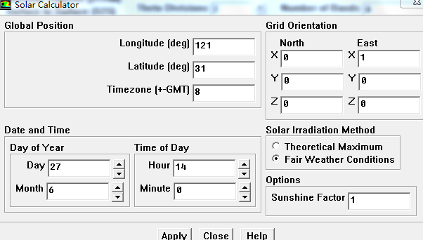 用fluent做太阳辐射模拟时,grid orientation参数怎么设置的