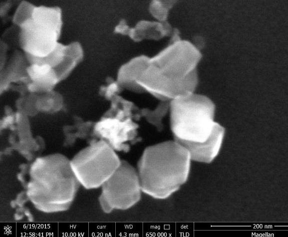 很不清楚啊,这个倍数建议用透射试试,而且形貌来说,感觉不太规则,就是个多面体一类的,也不是很纯的某一种多面体,建议测性能或者透射照晶面啥的,形貌不是太大亮点的感觉