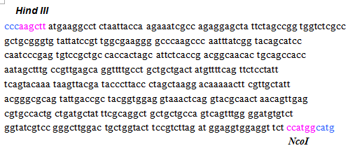 在上下游引物上分别加了 HindIII 和 NcoI 酶切位点,PCR后连到T载体上,测序显示扩增成功。