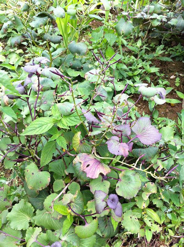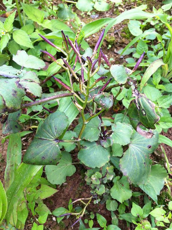 大家好,近期采集到一种植物,叶子是圆的,深绿色或紫色,能像油菜一样结籽,开白花,请帮忙鉴定下是什么植物,多谢。
