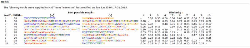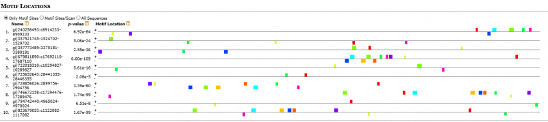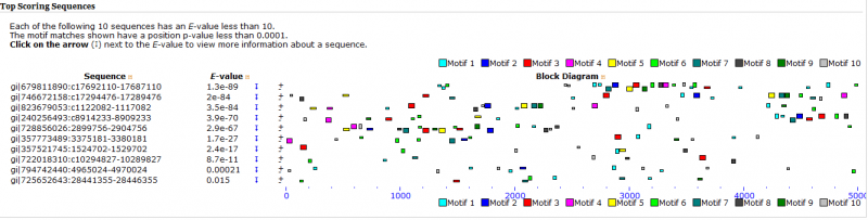 请帮忙看一下:下面的图是用10个物种的RD22基因做的MEME分析结果,这个结果怎么看?怎么阐述???