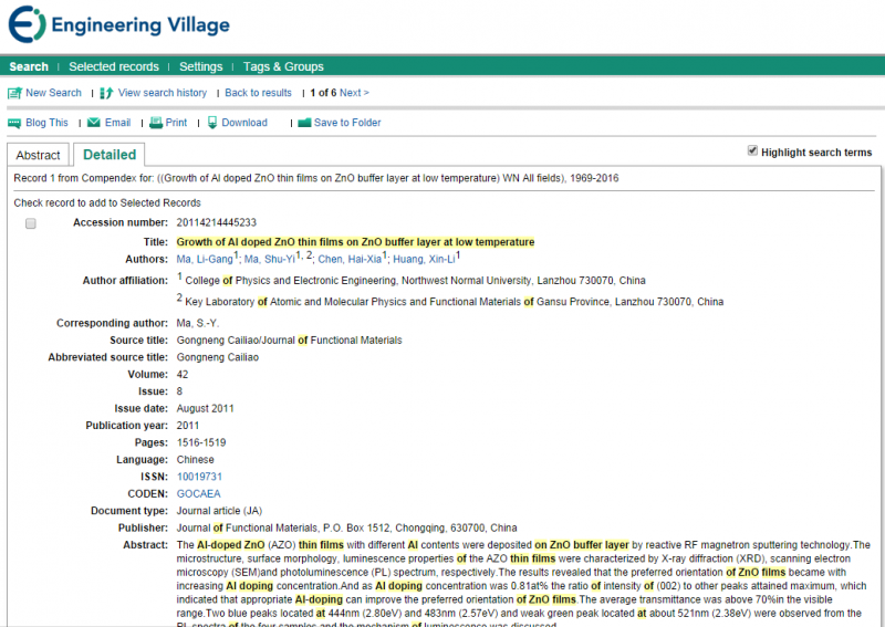 Accession number: 20114214445233 Title: Growth of Al doped ZnO thin films on ZnO buffer layer at low temperature Authors: Ma, Li-Gang1; Ma, Shu-Yi1, 2; Chen, Hai-Xia1; Huang, Xin-Li1 Author affiliation: 1 College of Physics and Electronic Engineering, Northwest Normal University, Lanzhou 730070, China 2 Key Laboratory of Atomic and Molecular Physics and Functional Materials of Gansu Province, Lanzhou 730070, China Corresponding author: Ma, S.-Y. Source title: Gongneng Cailiao/Journal of Functional Materials Abbreviated source title: Gongneng Cailiao Volume: 42 Issue: 8 Issue date: August 2011 Publication year: 2011 Pages: 1516-1519 Language: Chinese ISSN: 10019731 CODEN: GOCAEA Document type: Journal article (JA) Publisher: Journal of Functional Materials, P.O. Box 1512, Chongqing, 630700, China Abstract: The Al-doped ZnO (AZO) thin films with different Al contents were deposited on ZnO buffer layer by reactive RF magnetron sputtering technology.The microstructure, surface morphology, luminescence properties of the AZO thin films were characterized by X-ray diffraction (XRD), scanning electron microscopy (SEM)and photoluminescence (PL) spectrum, respectively.The results revealed that the preferred orientation of ZnO films became with increasing Al doping concentration.And as Al doping concentration was 0.81at% the ratio of intensity of (002) to other peaks attained maximum, which indicated that appropriate Al-doping can improve the preferred orientation of ZnO films.The average transmittance was above 70%in the visible range.Two blue peaks located at 444nm (2.80eV) and 483nm (2.57eV) and weak green peak located at about 521nm (2.38eV) were observed from the PL spectra of the four samples and the mechanism of luminescence was discussed. Number of references: 13 Main heading: Aluminum Controlled terms: Buffer layers - Magnetron sputtering - Metallic films - Optical films - Photoluminescence - Scanning electron microscopy - Semiconductor doping - Thin films - X ray diffraction - Zinc oxide Uncontrolled terms: Al content - Al doped ZnO thin films - Al-doped ZnO - Al-doping - AZO thin films - Low temperatures - Luminescence properties - Photoluminescence spectrum - PL spectra - Preferred orientations - rf-Magnetron sputtering - XRD - ZnO - ZnO buffer layer - ZnO films Classification code: 931.3 Atomic and Molecular Physics - 804.2 Inorganic Compounds - 741.3 Optical Devices and Systems - 741.1 Light/Optics - 933.1 Crystalline Solids - 714.2 Semiconductor Devices and Integrated Circuits - 539.3 Metal Plating - 539 Metals Corrosion and Protection; Metal Plating - 531 Metallurgy and Metallography - 541.1 Aluminum Database: Compendex Compilation and indexing terms, © 2015 Elsevier Inc. |