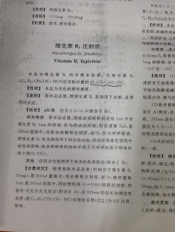 我是按照照片上方法做的,取1ml(相当于维生素B1 25mg吧)稀释到100ml,再取5ml稀释液稀释到100ml,在246nm处测吸光度为0.505,我是这样计算的:(0.505/421)*(1/100)*2000÷(25*10-3)=95.96%。不知道我计算的对不对? IMG_1852.JPG |