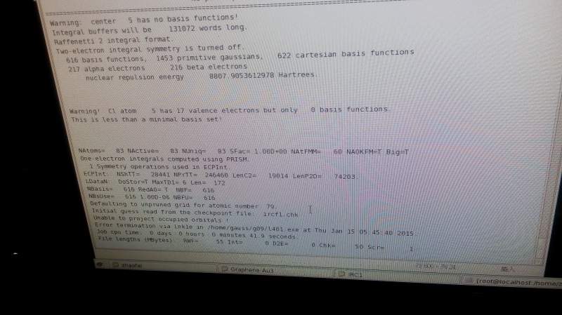 谢谢您,我改正错误后,再重新提交出现L401错误,您能帮我看一下是哪出问题了吗??我只知道l401代表初始MO猜测,网上对L401的解决办法有以下几种: Sample Text: Unable to locate IRWF=0 Number= 522. Error termination via Lnk1e in /global/apps/gaussian/g03.e01/g03/l401.exe