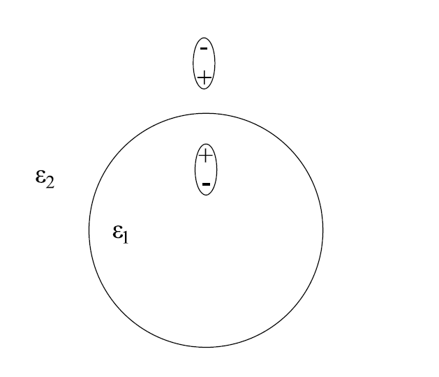 介电常数为ε1的球体处于介电常数为ε2的无限大电介质中,球体内部有一电偶极子