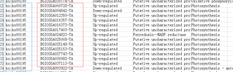 问题是图中红色框内如BGIOSGA004842-TA这个基因 这个是用ensembl数据库得到的(http://ensembl.gramene.org/Oryza ... TA;site=ensemblthis),在生物公司测的,如何和kegg通路中 如图1中的红色的基因相对应,图2中基因注释都是Putative uncharacterized protein(假设的不确定的蛋白),但是kegg红色部分都是已经给出了明确的基因名称,这个和测序结果是不是相违背? 该如何对应起来?谢谢 这是图1file:///G:/%E5%8D%9A%E5%A3%AB%E8%AF%BE%E9%A2%98%E5%AE%9E%E9%AA%8C%E6%95%B0%E6%8D%AE/%E8%BD%AC%E5%BD%95%E7%BB%84%E6%95%B0%E6%8D%AE2015-5-15/GZRB2014102402149-SSQ_custom/05.KEGG/sample812S--sample812HS/KEGGgraph/ko00195.html 这是图2 图 1.png 图2.png |