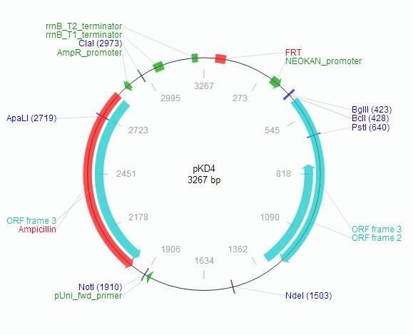 如图所示,ORF frame 3就是卡那的基因,我想用此卡那基因替换掉另一个质粒上的氨苄基因。现在有如下疑问:1 NEOKAN promoter是不是卡那基因的启动子? 2 是否将NEOKAN promoter跟卡那基因一起替换另一质粒上的氨苄启动子开始到氨苄结束的整段基因? 请高手解围,多谢! pKD4载体图谱2.jpg |
