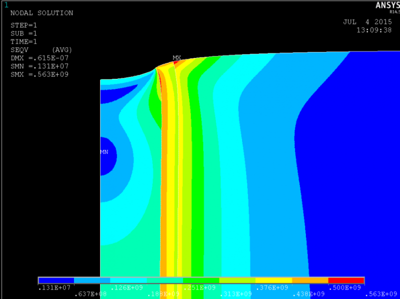 建了个含不同材料区域的模型,仿真后发现normal stress和shear stress都是连续的,但von Mises stress在界面处产生了突变,请问这正常么?如果不正常那是什么原因导致的呢?请大神指教