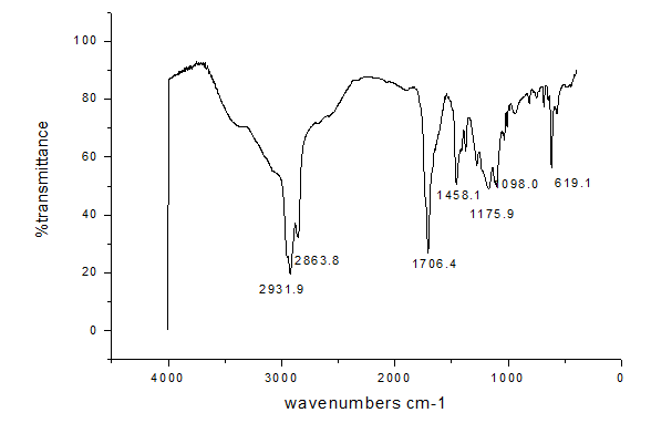 2931,2863是亚甲基的不对称伸缩振动和对称伸缩振动。1706是羧酸羰基的伸缩振动,1458是亚甲基的面外弯曲振动,1175是C-O的对称伸缩振动,619是当亚甲基数量大于2的时候出现的亚甲基的面内弯曲振动