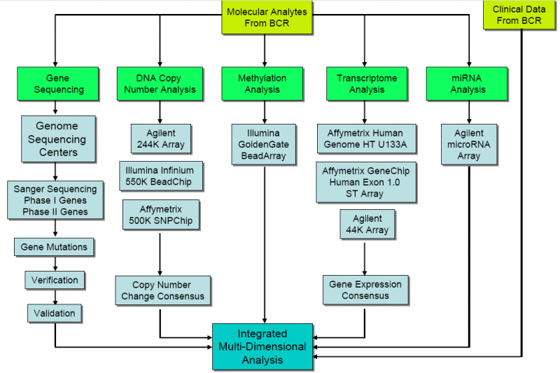 国政府发起的癌症和肿瘤基因图谱(Cancer Genome Atlas,TCGA)计划,试图通过应用基因组分析技术,特别是采用大规模的基因组测序,将人类全部癌症(近期目标为50种包括亚型在内的肿瘤)的基因组变异图谱绘制出来,并进行系统分析,旨在找到所有致癌和抑癌基因的微小变异,了解癌细胞发生、发展的机制,在此基础上取得新的诊断和治疗方法,最后可以勾画出整个新型“预防癌症的策略”。 TCGA 使命:提高人们对癌症发病分子基础的科学认识及提高我们诊断、治疗和预防癌症的能力 TCGA 目标:完成一套完整的与所有癌症基因组改变相关的“图谱”。 图1.png TCGA数据源大部分都是公开的,如何有效的进行收集和预处理是一个头疼的问题。今天我们讲解下怎么将TCGA的数据转化成癌症类型的二维数据矩阵(例如基因为rows,样本为columns)。得到这个矩阵之后,后面的事情就好办了,我们可以做差异表达,共表达网络,生存分析等。今天我们主要讲解如何下载TCGA的数据,大家对后续分析感兴趣的话,可以在加“生物信息培训+视频”裙,或者大家可以在掏宝搜索“生物信息视频”,跟我们联系。 我们开始吧,我们可以使用TCGA-Assembler这软件去下载TCGA的数据http://www.compgenome.org/TCGA-Assembler/。TCGA-Assembler不但可以很方便的下载数据,还能对数据进行初始化处理,非常方便。下载完后,我们使用首先要安装一些依赖包。通过下面的命令: install.packages(c("HGNChelper", "RCurl", "httr", "stringr", "digest", "bitops" , dependencies=T)安装完了依赖包,我们进入刚才下载的TCGA-Assembler的目录,使用setwd(C:/Users/cloud/Desktop/TCGA-Assembler)设置TCGA-Assembler的目录为工作目录,接下来,我们就可以下载数据了。我们需要下载什么数据,就选择相应的脚本。具体脚本如下: # Load module A functions. source("Module_A.r" ;# Download level-3 miRNA-seq data of six rectum adenocarcinoma (READ) samples miRNASeqRawData = DownloadmiRNASeqData(traverseResultFile = "./DirectoryTraverseResult_Jul-08-2014.rda", saveFolderName = "./QuickStartGuide_Results/RawData/", cancerType = "READ", assayPlatform = "miRNASeq", inputPatientIDs = c("TCGA-EI-6884-01", "TCGA-DC-5869-01", "TCGA-G5-6572-01", "TCGA-F5-6812-01", "TCGA-AF-2689-11", "TCGA-AF-2691-11" ); # Download level-3 DNA copy number data of six READ samples CNARawData = DownloadCNAData(traverseResultFile = "./DirectoryTraverseResult_Jul-08-2014.rda", saveFolderName = "./QuickStartGuide_Results/RawData/", cancerType = "READ", assayPlatform = "genome_wide_snp_6", inputPatientIDs = c("TCGA-EI-6884-01", "TCGA-DC-5869-01", "TCGA-G5-6572-01", "TCGA-F5-6812-01", "TCGA-AF-2692-10", "TCGA-AG-4021-10" ); # Download level-3 RNASeqV2 gene expression and exon expression data of six READ samples RNASeqRawData = DownloadRNASeqData(traverseResultFile = "./DirectoryTraverseResult_Jul-08-2014.rda", saveFolderName = "./QuickStartGuide_Results/RawData/", cancerType = "READ", assayPlatform = "RNASeqV2", dataType = c("rsem.genes.normalized_results", "exon_quantification" , inputPatientIDs = c("TCGA-EI-6884-01", "TCGA-DC-5869-01", "TCGA-G5-6572-01", "TCGA-F5-6812-01", "TCGA-AG-3732-11", "TCGA-AG-3742-11" ); # Download level-3 HumanMethylation27 data of six READ samples Methylation27RawData = DownloadMethylationData(traverseResultFile = "./DirectoryTraverseResult_Jul-08-2014.rda", saveFolderName = "./QuickStartGuide_Results/RawData/", cancerType = "READ", assayPlatform = "humanmethylation27", inputPatientIDs = c("TCGA-AG-3583-01", "TCGA-AG-A032-01", "TCGA-AF-2692-11", "TCGA-AG-4001-01", "TCGA-AG-3608-01", "TCGA-AG-3574-01" ); # Download level-3 HumanMethylation450 data of six READ samples Methylation450RawData = DownloadMethylationData(traverseResultFile = "./DirectoryTraverseResult_Jul-08-2014.rda", saveFolderName = "./QuickStartGuide_Results/RawData", cancerType = "READ", assayPlatform = "humanmethylation450", inputPatientIDs = c("TCGA-EI-6884-01", "TCGA-DC-5869-01", "TCGA-G5-6572-01", "TCGA-F5-6812-01", "TCGA-AG-A01W-11", "TCGA-AG-3731-11" ); # Download level-3 RPPA protein expression data of six READ samples RPPARawData = DownloadRPPAData(traverseResultFile = "./DirectoryTraverseResult_Jul-08-2014.rda", saveFolderName = "./QuickStartGuide_Results/RawData", cancerType = "READ", assayPlatform = "mda_rppa_core", inputPatientIDs = c("TCGA-EI-6884-01", "TCGA-DC-5869-01", "TCGA-G5-6572-01", "TCGA-F5-6812-01", "TCGA-AG-3582-01", "TCGA-AG-4001-01" ); # Download de-identified clinical information of READ patients DownloadClinicalData(traverseResultFile = "./DirectoryTraverseResult_Jul-08-2014.rda", saveFolderName = "./QuickStartGuide_Results/RawData", cancerType = "READ", clinicalDataType = c("patient", "drug", "follow_up" );运行上面的脚本,我们就能得到我们想要的结果了,假如我们需要下载adenocarcinoma的miRNA数据,我们可以使用。下载完后,我们就得到了adenocarcinoma的矩阵了(基因为rows,样本为columns)。 setwd(C:/Users/cloud/Desktop/TCGA-Assembler) source("Module_A.r" ;miRNASeqRawData = DownloadmiRNASeqData(traverseResultFile = "./DirectoryTraverseResult_Jul-08-2014.rda", saveFolderName = "./QuickStartGuide_Results/RawData/", cancerType = "READ", assayPlatform = "miRNASeq" ; |