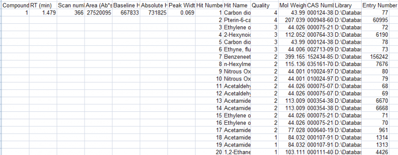 Agilent 5973数据处理工作站中,路径:export reports——library search results report to XLS中,导出的报告,一个出峰时间会出现十几个化合物峰,怎样设置显示的化合物数目、匹配度值等参数?请各位大侠帮忙!万分感谢! 导出报告.png |