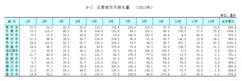 先来个温度信息 http://www.360doc.com/content/15/0101/22/605353_437421201.shtml 下面这个是综合信息,包括降雨量 http://www.jssb.gov.cn/tjxxgk/tjsj/tjnq/2011/index_212.html 统计年鉴里面的“能源-资源-环境——主要城市月降水量”里面可以查到南京的降雨量。 不是很全面就是了 |