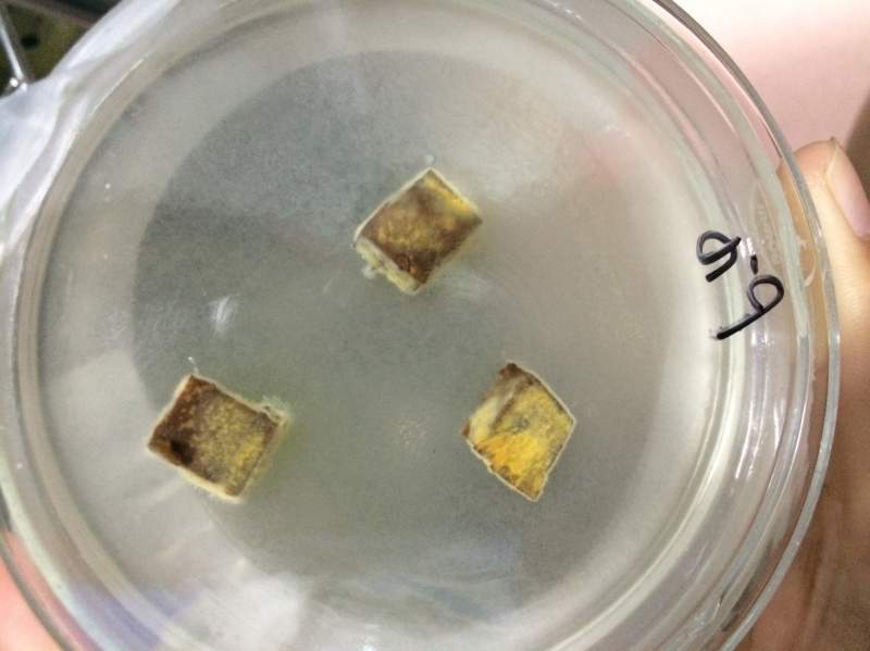 本人做的野生桑黄菌母本分离,一直分不出来,子实体用酒精擦拭表面后接入PDA培养基中,大部分长出青霉,少部分长出菌丝的周围也有青霉菌长出,拿出来继代之后菌丝就不能继续生长了。试过将长出的菌丝拿来划线,但是仍旧长不出。本人做的如图 PIC_20150607_173103_E04.jpg PIC_20150617_163653_68E.jpg |