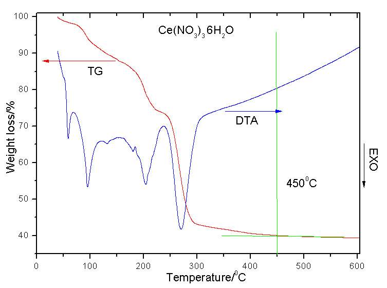 您好,您看一下,我分析的对不对。1、从DTA的曲线来看,200℃到250℃之间,是硝酸铈分解生成氧化铈的放热峰吗?2、50℃到100℃的时间吸热峰,是因为水分的蒸发而吸热吗?3、还有在200℃和270℃有吸热峰是什么原因?麻烦大神告知一下。谢谢!