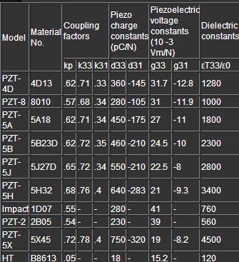 最近需要买一片PZT-4矩形片压电陶瓷晶片来做实验用,打算利用其长度方向的振动作为振动器。这样的P-5的材料是不是不合适啊?我记得P-5压电陶瓷是高灵敏度接收型的,适合用来做压电传感器之类的,不适合作为功率发射型的材料,是这样吗? 那么为什么下图(截自某公司网站)中PZT-5H的d31和d33都比PZT-4的高呢?(好不容易联系到有尺寸合适的现货的厂家可是人家只有P-5H的,不知能不能用……)