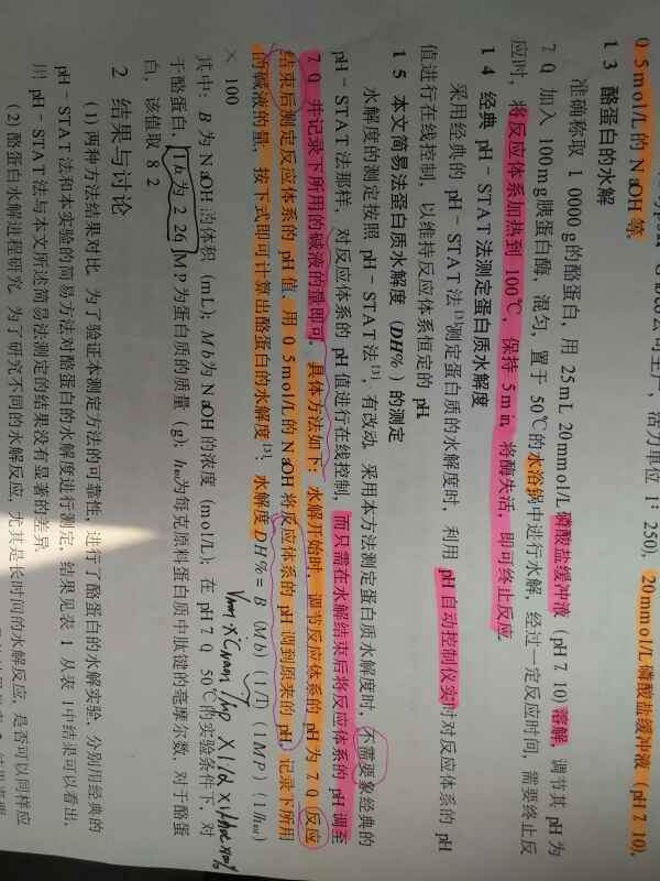我在做酶解改性的实验,需要计算酶的水解度(DH)值,目前准备用pH-stat法进行测定,但是我做的这个是一种新蛋白,相关的研究尚未见刊,我想求助各位,公式中的α如何计算?我搜索论坛找到一个公式”:DH(%) ﹦h/htot ﹦(B×Nb)/Mp×α×htot α ﹦1/(1+10PK-PH) PK﹦7.8+[(298-T)/298×T] T是水解过程中的绝对温度“,这个绝对温度T我不太懂,是水解过程中这个酶的最适温度么?还有就是计算α需要pH值,这个值是当前酶的最适pH么?我询问过实验室酶制剂的生产厂家,酶的最适pH是一个范围呀,这该如何计算? 在论坛搜索了半天,真是看得一头雾水,答案都回答的太高深了完全看不懂 ,这个α中的pK和pH究竟应该怎么确定呀?因为改性试验要用好多种不同的酶,所以熟悉方法对我而言很重要,真心请各位不吝赐教 ,请尽量说的通俗一点 ,谢谢! |