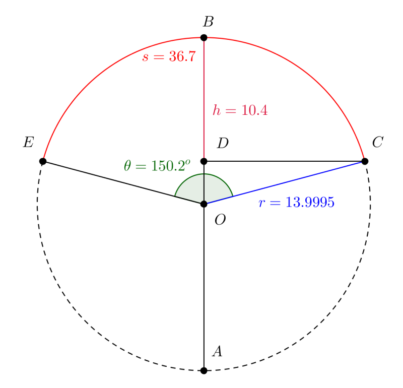 已知弧长36.7米,拱高10.4米的圆弧,求圆的半径和圆心角(最好附带Matlab程序)。怎么限制x是锐角? clear all; syms x y [x,y]=solve('2*x*y-36.7=0','y*(1-cos(x))-10.4=0','x','y'); solution=[x,y] |