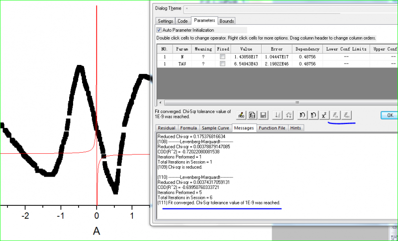 如果所示,origin 2015 做拟合时候,提示已经收敛了。但是,拟合的曲线和原图曲线根本就不符合。而且把拟合Iteration 设置到2000,tolerance 10^-9. 但是点击拟合时候,很快就提示收敛,不到2000步,然后就不运行了。这是什么原因呢?图形看起来很不符合,拟合就过一点都不好,为什么还是已经收敛了。 捕获.PNG |