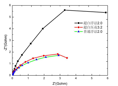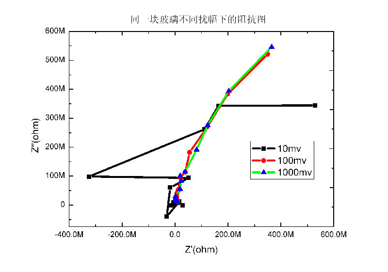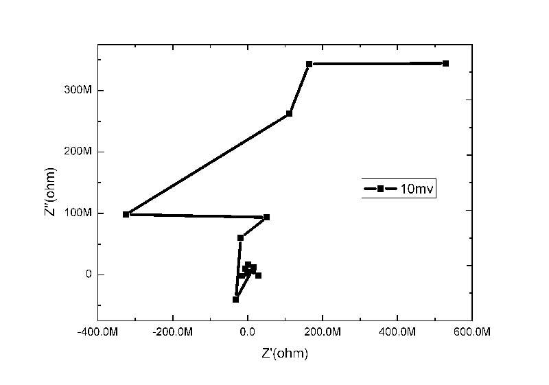 你这种结果我不太清楚,不好判断,但是已经可以看到有一些圆弧的趋势了。前面你说的的样品阻抗R在几百GΩ,相应的圆弧半径也大约在R/2处,而你的测试条件只能显示到400MΩ左右,所以不能显示完整的半圆弧。如果你想显示出半圆弧,需要把低频段继续降低,就看你的仪器最低能到多少了。
