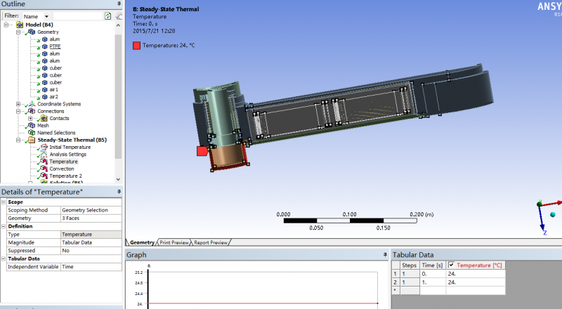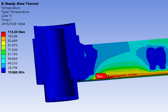 用ANSYS做稳态热模拟实验,环境加载条件为对流100℃,35W/(m2℃)。其他的都比较正常,节点最高温度为93℃,可是这个的最高节点温度出现了113℃。重新检查加载条件貌似都是正常的,网上有类似情况说是由于有限元计算的离散误差。可我这个误差也忒大了吧...