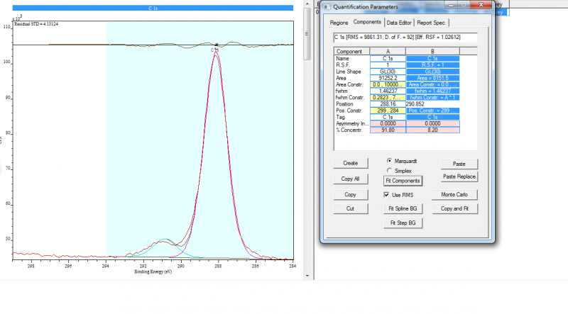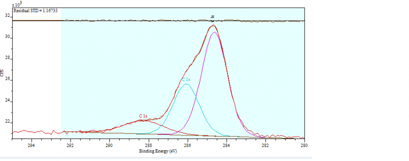 我觉得处理前样品里面碳有两种 C-C和COOAg,处理之后呢应该有三种C-C,COOAg,COOH,所以就做了xps C1s窄谱,我自己分峰处理了一下未处理样品分两个峰拟合不好(也许大概是我没拟合好)位置在284.6和287.3(图1,原图有3.6的电荷漂移),处理的样品三个峰,拟合的较好,284.6,286.1,288.3(图2). 284.6应该是对应C-C,然后剩下的几个不知道怎么算了,按说俩个里面都有COOAg 应该有一个位置对应。。反正分析无能了,,有哪位高手指点下,感激不尽