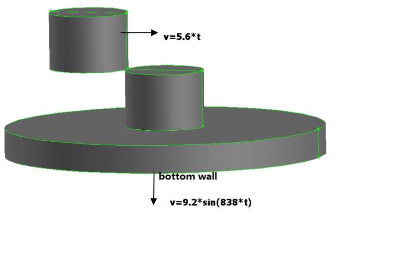 图中左上方的圆柱形水平匀速向右运动,且与中间的圆柱形相贴合。最下方圆柱形的底面向下做余弦运动。这两个运动是同时进行,请问如何用udf编写程序?