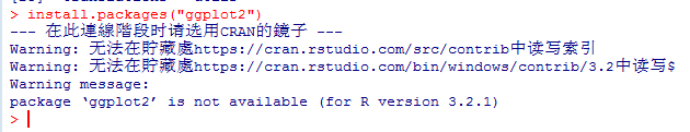 安装ggplot2包总是提示如图错误,换了一次版本还是不行,同样的问题,求高人赐教!谢谢! 不知道截图有没有上传成功,把问题复制粘贴一下,如下” “install.packages("ggplot2" ![]() --- 在此連線階段时请选用CRAN的鏡子 --- Warning: 无法在貯藏處https://cran.rstudio.com/src/contrib中读写索引 Warning: 无法在貯藏處https://cran.rstudio.com/bin/windows/contrib/3.2中读写索引 Warning message: package ‘ggplot2’ is not available (for R version 3.2.1) " QQ图片20150727101023.png |