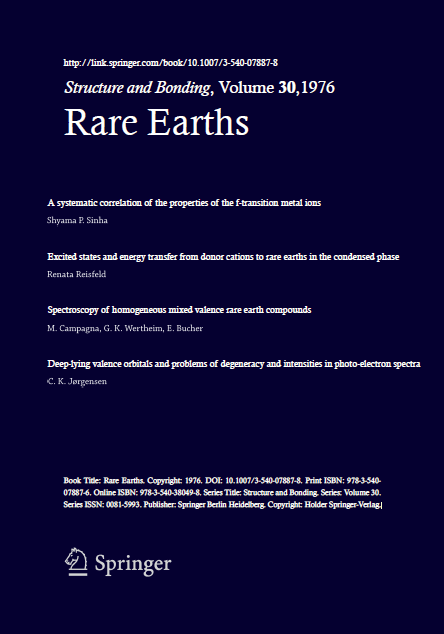 很古老的书了,Structure and Bonding 丛书的第30本。 内容是比较经典的稀土相关的知识,作为一本参考书还是不错的。 跟国内一样,前一辈的老科学家们,都严谨。 http://link.springer.com/book/10.1007/3-540-07887-8 Structure and Bonding, Volume 30,1976 Rare Earths 1 A systematic correlation of the properties of the f-transition metal ions 2 Excited states and energy transfer from donor cations to rare earths in the condensed phase 3 Spectroscopy of homogeneous mixed valence rare earth compounds 4 Deep-lying valence orbitals and problems of degeneracy and intensities in photo-electron spectra Book Title: Rare Earths. Copyright: 1976. DOI: 10.1007/3-540-07887-8. Print ISBN: 978-3-540-07887-6. Online ISBN: 978-3-540-38049-8. Series Title: Structure and Bonding. Series: Volume 30. Series ISSN: 0081-5993. Publisher: Springer Berlin Heidelberg. Copyright: Holder Springer-Verlag. . ![]() . 20150728_011156.png |
