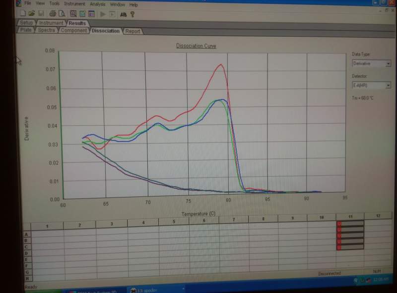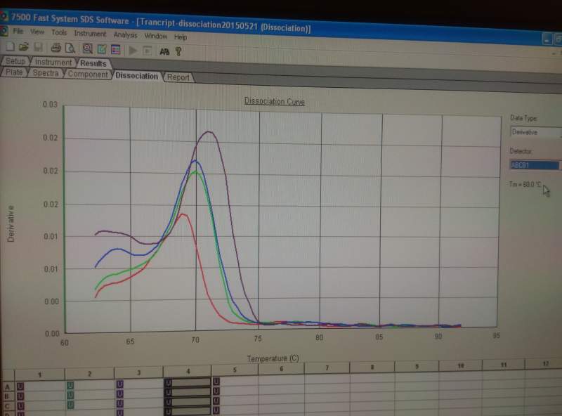 请求各位大侠帮助:我最近在做RT-PCR,用的SYBR Green法,扩增完了然后跑溶解曲线,但是溶解曲线的图如下,不知道是否是我想要的产物,引物能否可用,求帮助分析.仪器为AB 7500fast