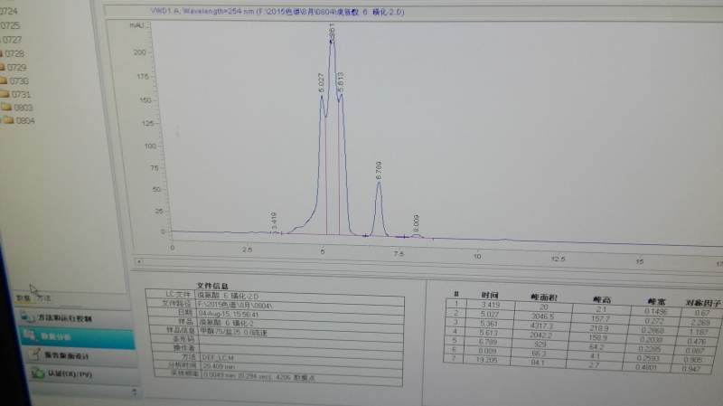 2、调节流动相中甲醇的含量,你可以多尝试,找到最佳比例。暂时不要加酸碱体系,因为你的样品比较稳定,加了酸碱反而增加了你的工作量;