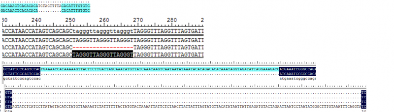大家好,求助如何区分DNA中的内含子起始位点,内含子的特征是什么?我克隆的基因DNA比cDNA多了一段,但具体从哪里起始呢? 大家帮我看看,图中长的是DNA,短的是cDNA扩增测序结果,以第二个为例,可以看做TAGGGTTTAGGGTT,也可以看做GGGTTTAGGGTTTA,貌似是两个7 bp 重复的微卫星序列。图中四个基因,求帮忙确认内含子位点,并告知方法,不胜感激,谢谢。 1111.PNG |