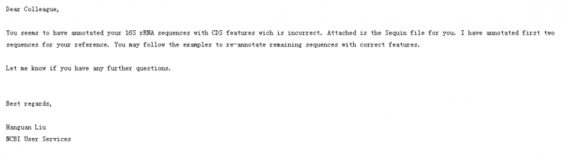 小弟第一次提交核酸序列,菜鸟一个,上周向NCBI提交我做实验得到的序列,提交后NCBI发来邮件说我提交的序列有很多错误,请大神帮忙看看什么意思,需要怎么修改,下面是邮件的部分截图,其中第3和第4张图是我保存的sqn文件用sequin软件打开后出现的错误截图。我需要怎么修改,麻烦说的具体点,小弟在此先拜谢了!! 1.png 2.png 3.png 4.png |