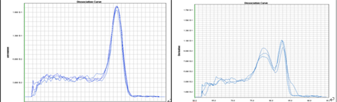 现在小弟在做蜡块组织mRNA表达量的试验,得出了一个比较神奇的结果,因为蜡块组织比较有限而且提取RNA浓度低,所以开始设计实验验证扩增效率的时候都是用的新鲜组织提出来的RNA转成的cDNA,用这个时在Ct=31左右的时候熔解曲线一直是一个峰,但是差不多同样的Ct值,蜡块组织提出来的RNA转cDNA为模板的熔解曲线就是两个峰,阴性虽然抬起,但峰位置也不是那里,求大神解答。 1.png |