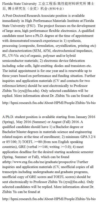 借宝地做个广告! 佛罗里达州立大学 (FSU) 工业工程系/高性能材料研究所 博士后, 博士研究生(全奖)机会 (材料专业) 详情请见 http://muchong.com/bbs/viewthread.php?tid=9251849&fpage=1 多谢! 1.jpg |